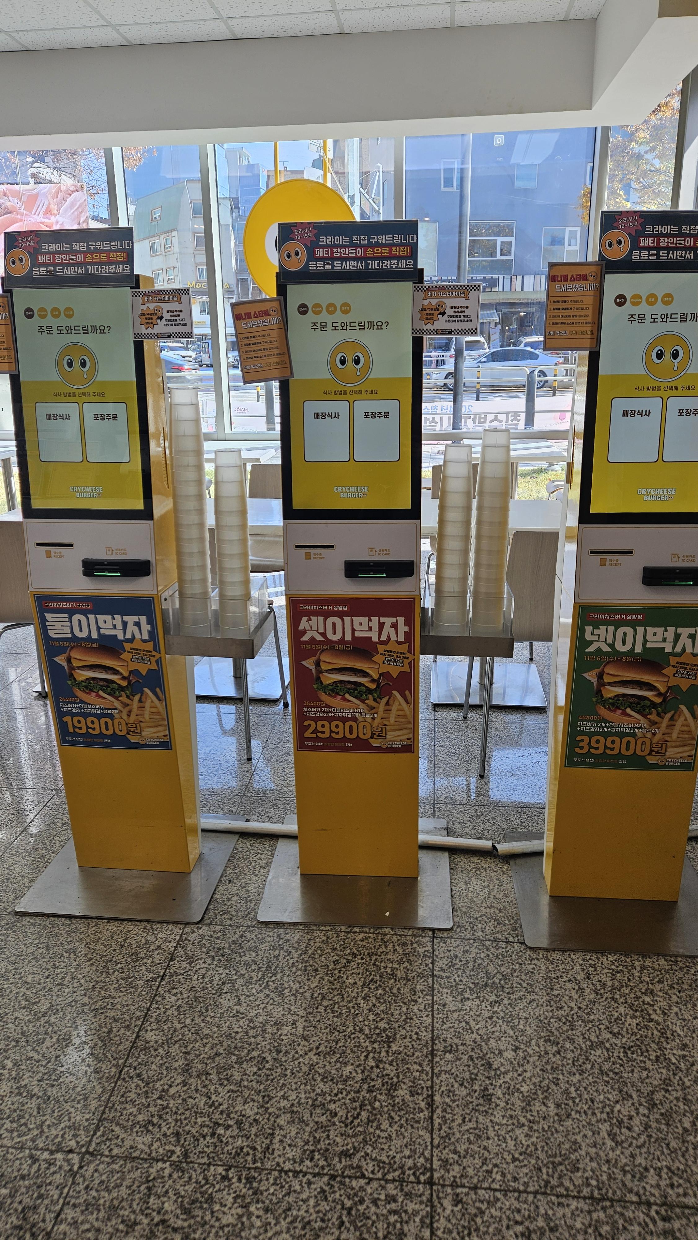 입구 들어서면 키오스키 3개가 나란히 서있다.