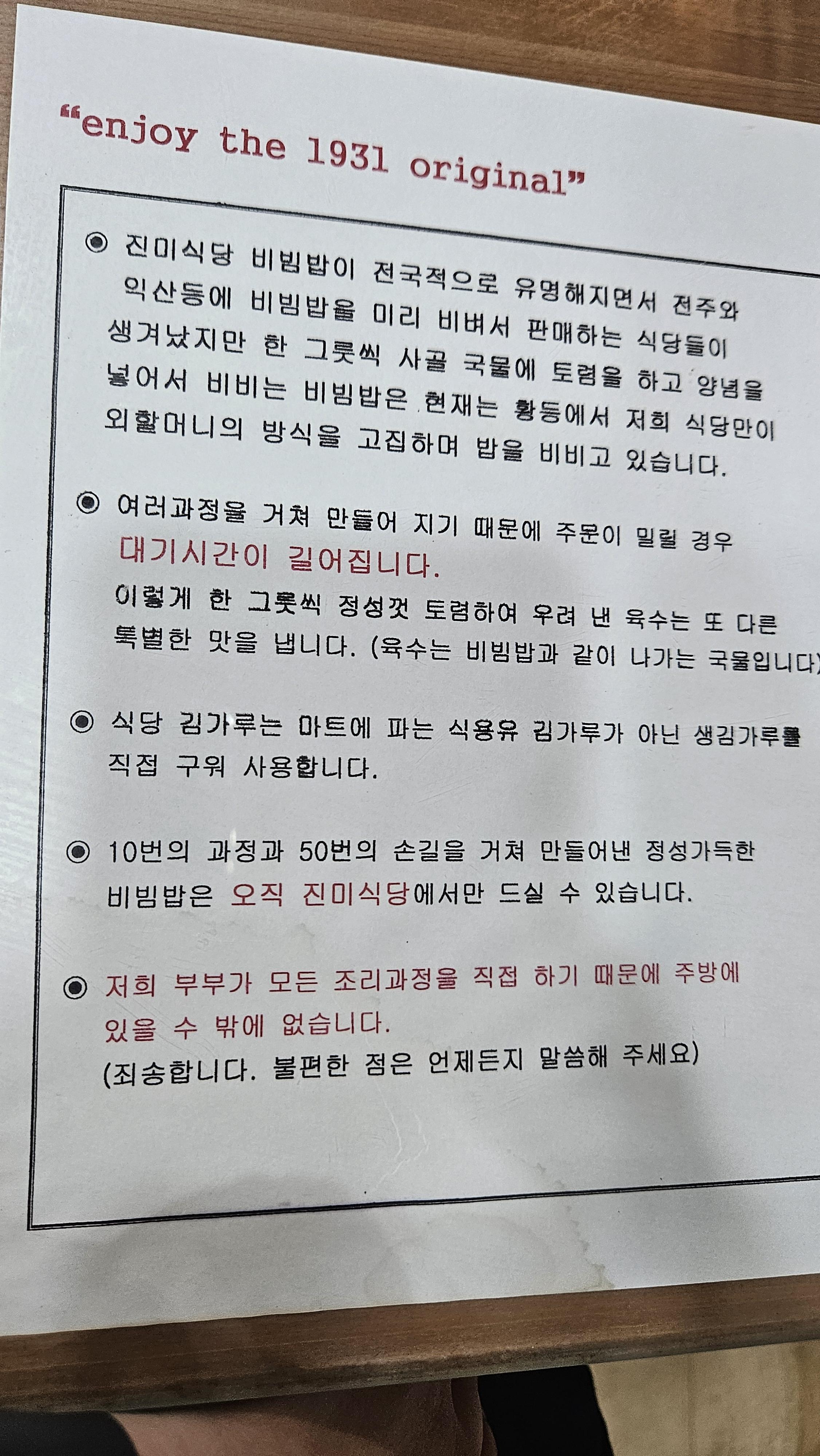 오랜역사를 지닌 식당답게 음식에대한 프라이드가 느껴지는 안내문구가 많이 보인다.