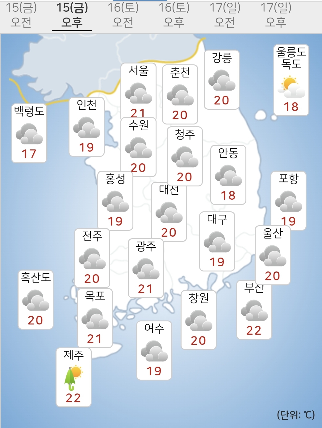 - 오늘(15일) 낮최고기온은 17~22도가 되겠습니다.