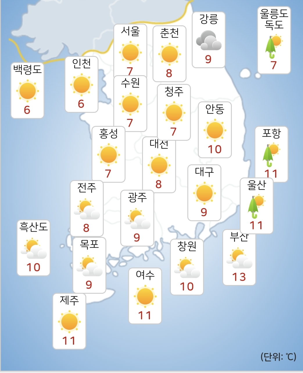 - 오늘(18일) 낮최고기온은 6~13도가 되겠습니다.