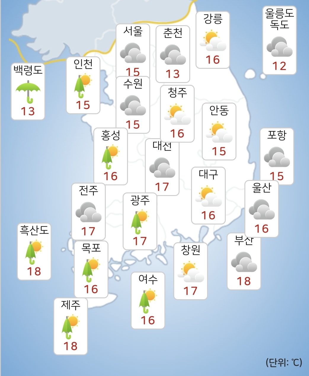- 오늘(25일) 낮최고기온은 13~18도가 되겠습니다.