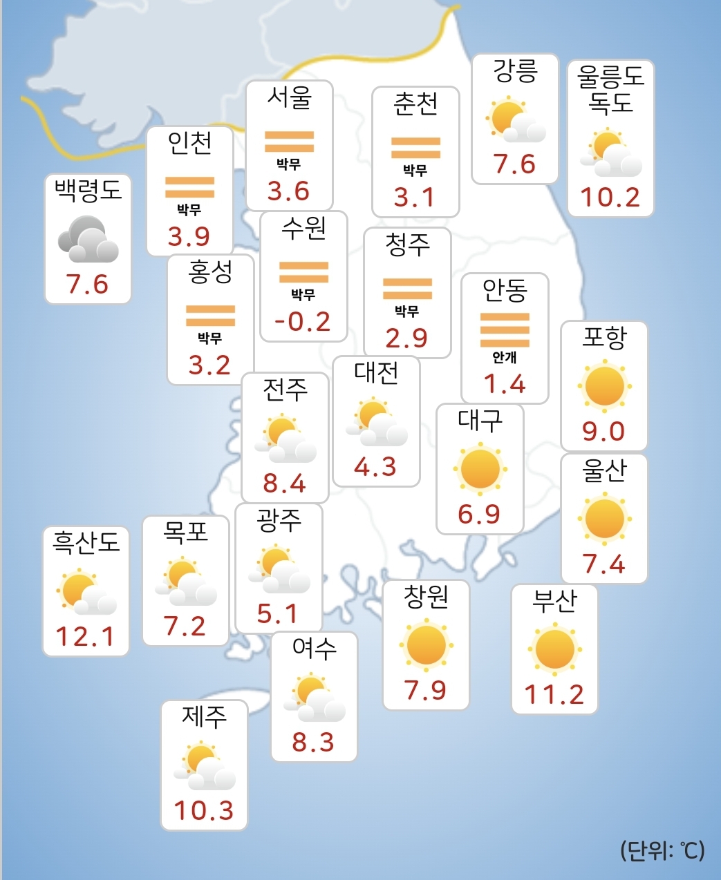 - 모레(3일) 아침최저기온은 -7~4도, 낮최고기온은 2~11도가 되겠습니다.