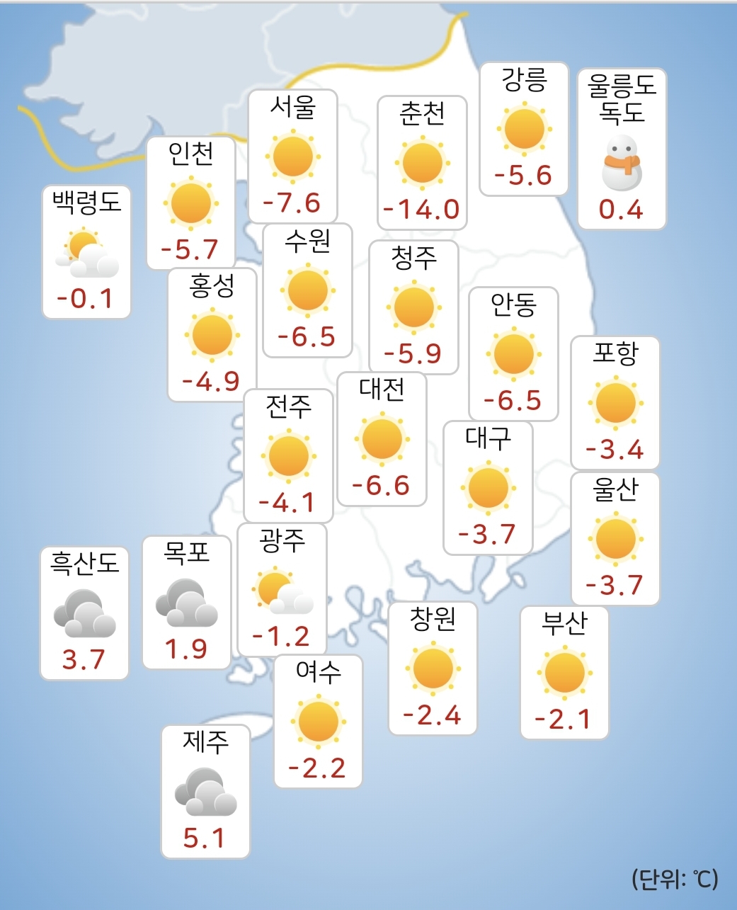 ○ (기온) 아침 기온은 -10~2도, 낮 기온은 3~10도가 되겠습니다.