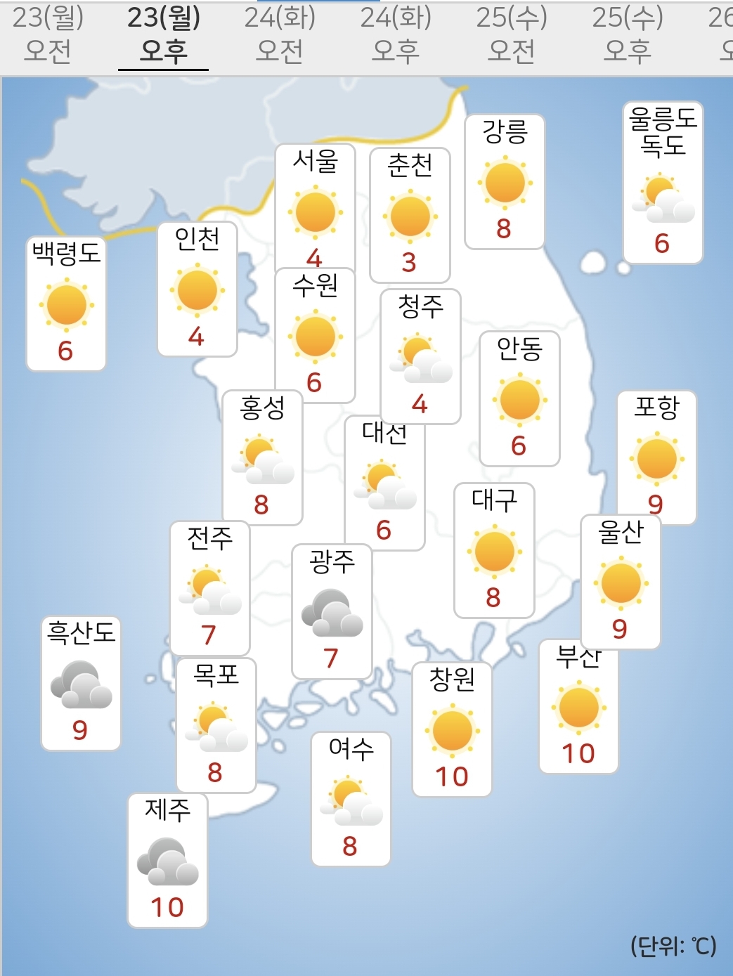 - 오늘(23일) 낮최고기온은 2~10도가 되겠습니다.