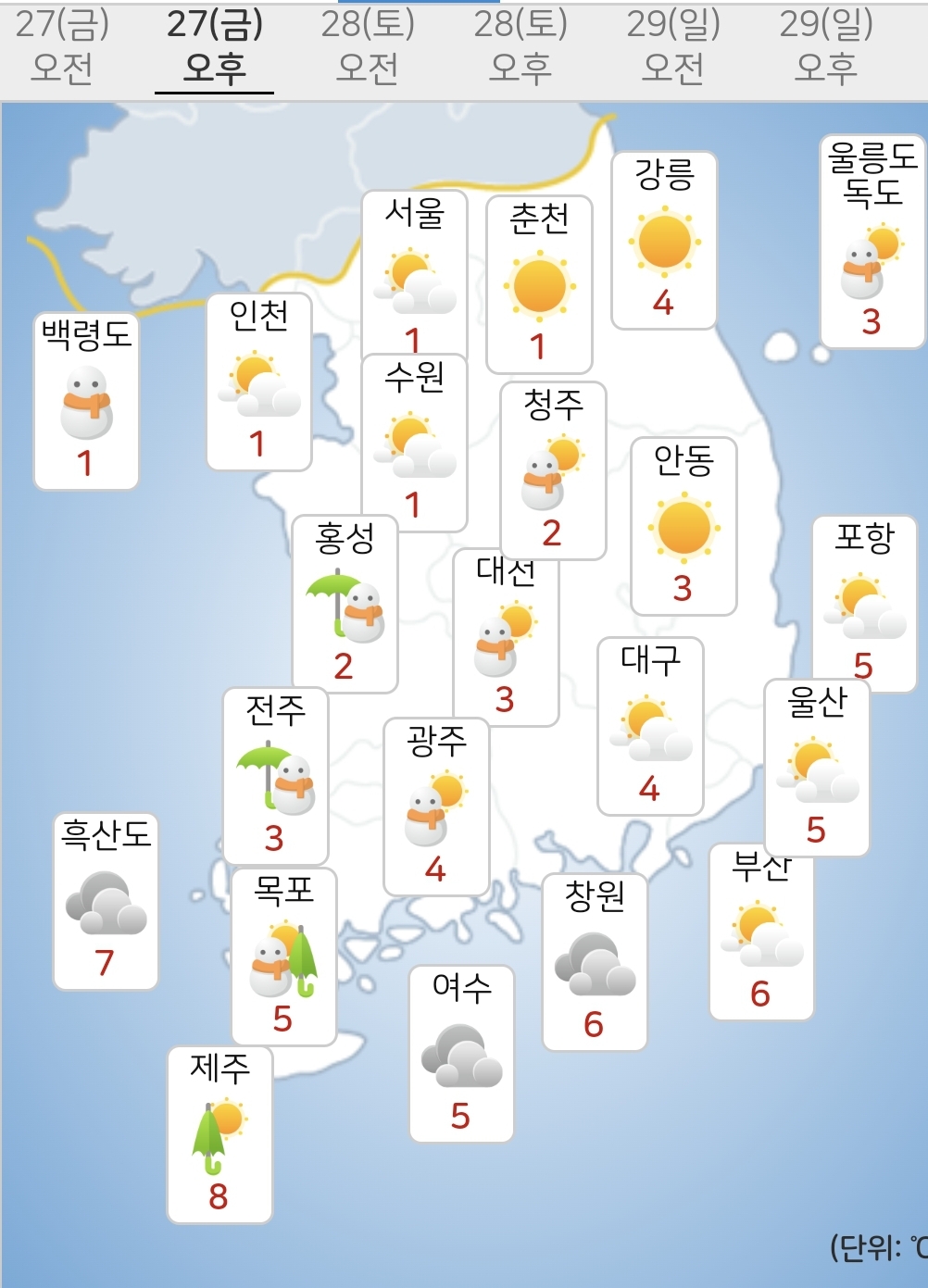 - 오늘(27일) 낮최고기온은 -1~7도가 되겠습니다.