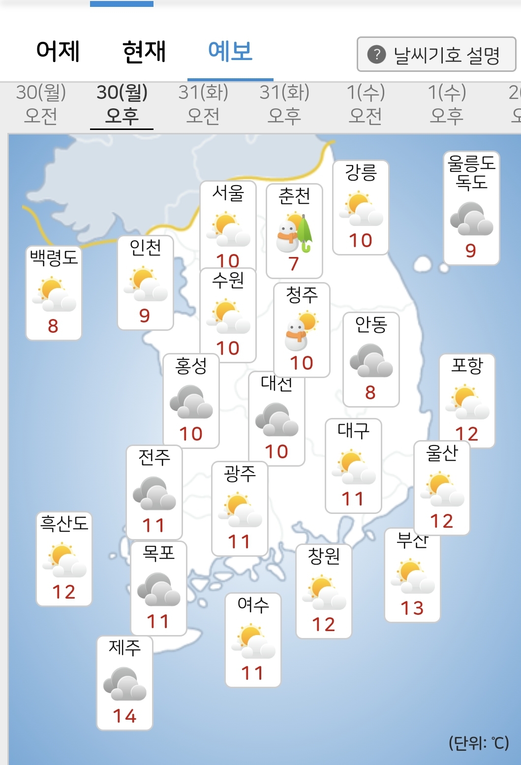 - 오늘(30일) 낮최고기온은 7~13도가 되겠습니다.