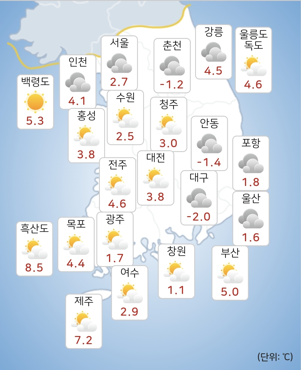 - 내일(31일) 아침최저기온은 -7~4도, 낮최고기온은 2~9도가 되겠습니다.
