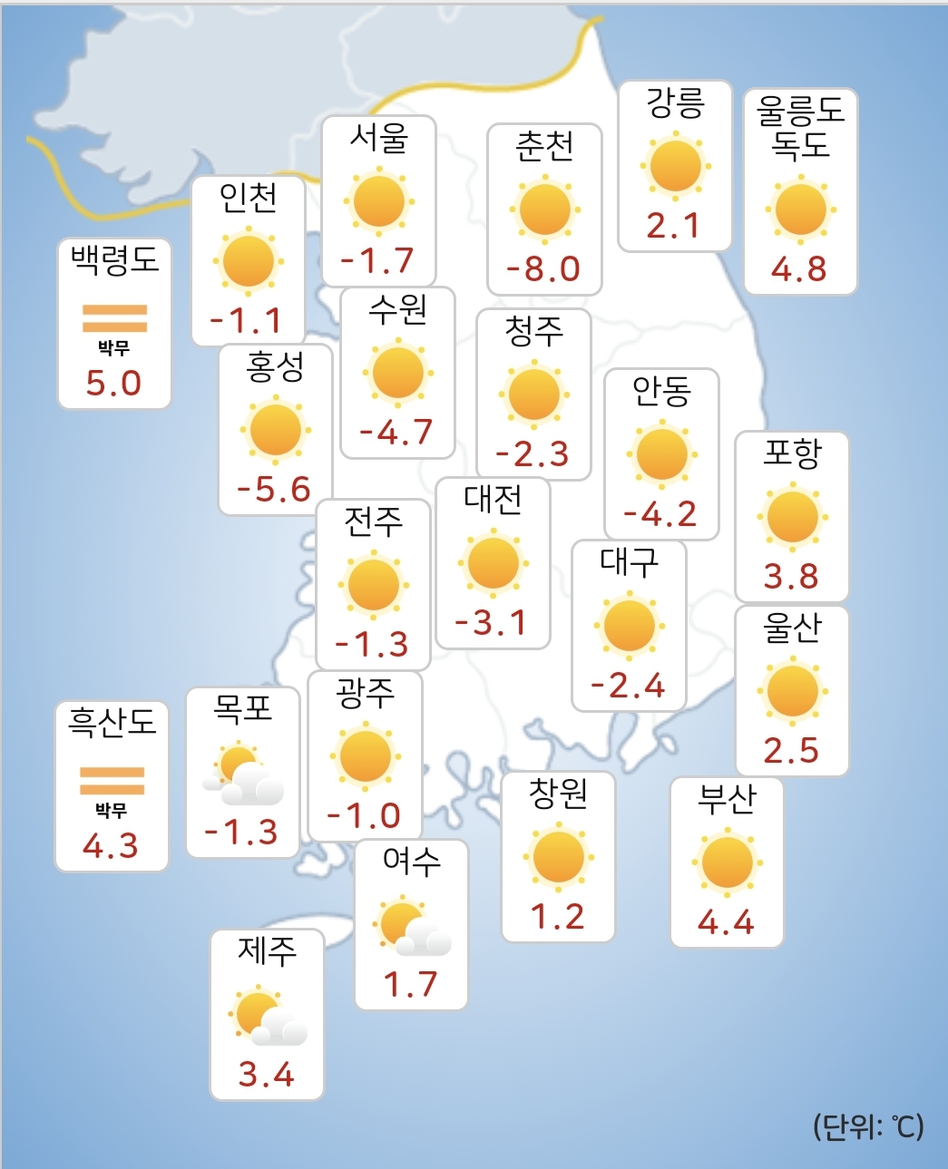- 모레(3월 1일) 아침최저기온은 -2~7도, 낮최고기온은 10~17도가 되겠습니다.