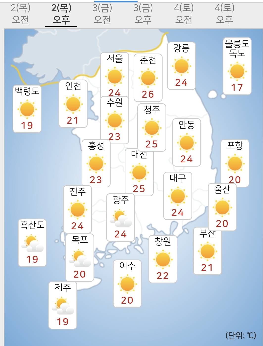 - 오늘(2일) 낮최고기온은 18~26도가 되겠습니다.