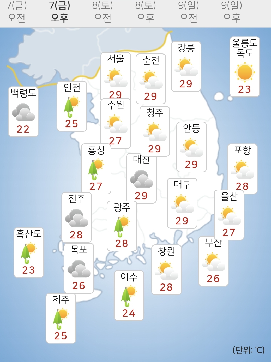 - 오늘(7일) 낮최고기온은 24~30도가 되겠습니다.