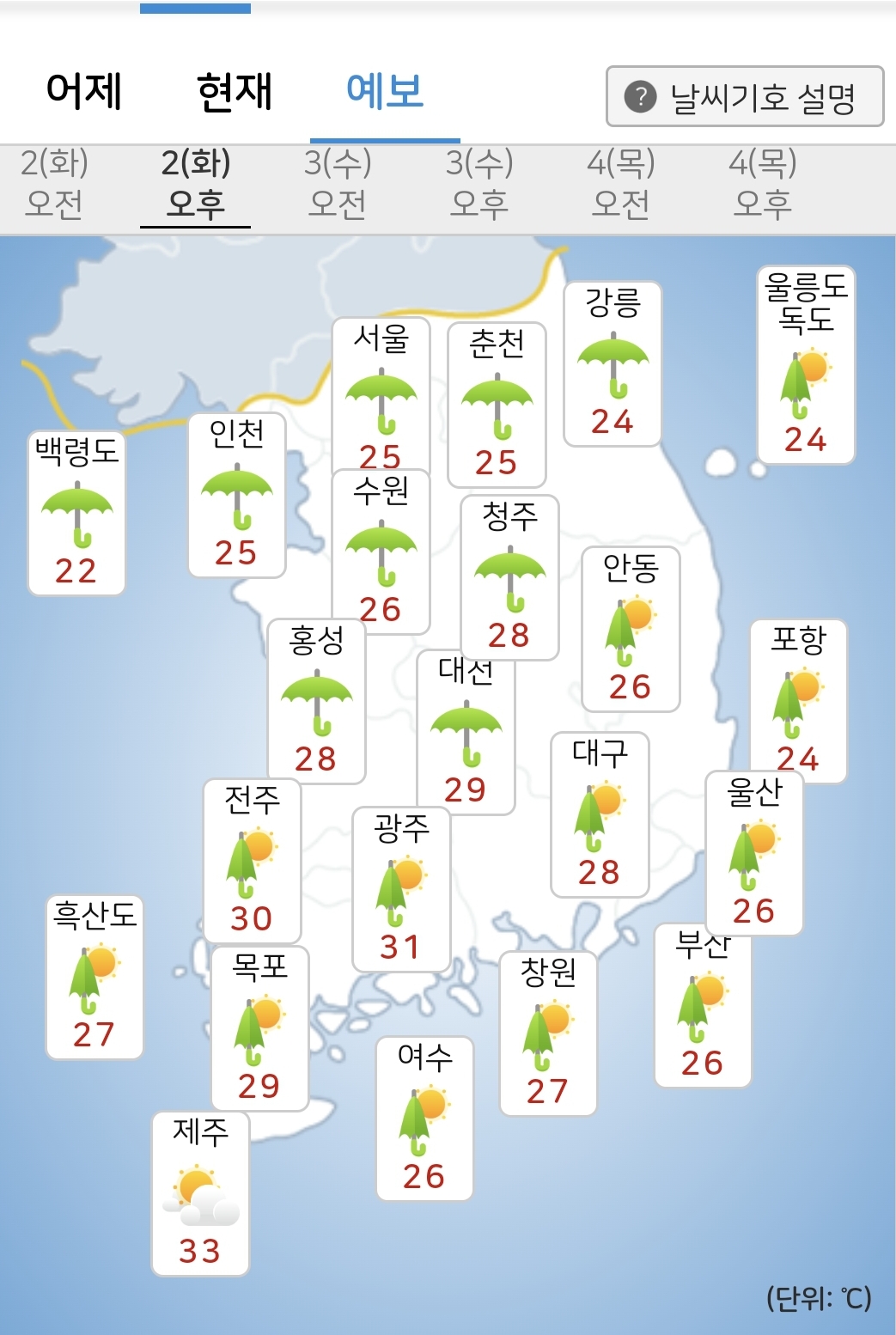 - 내일(3일) 아침최저기온은 22~26도, 낮최고기온은 25~32도가 되겠습니다.
