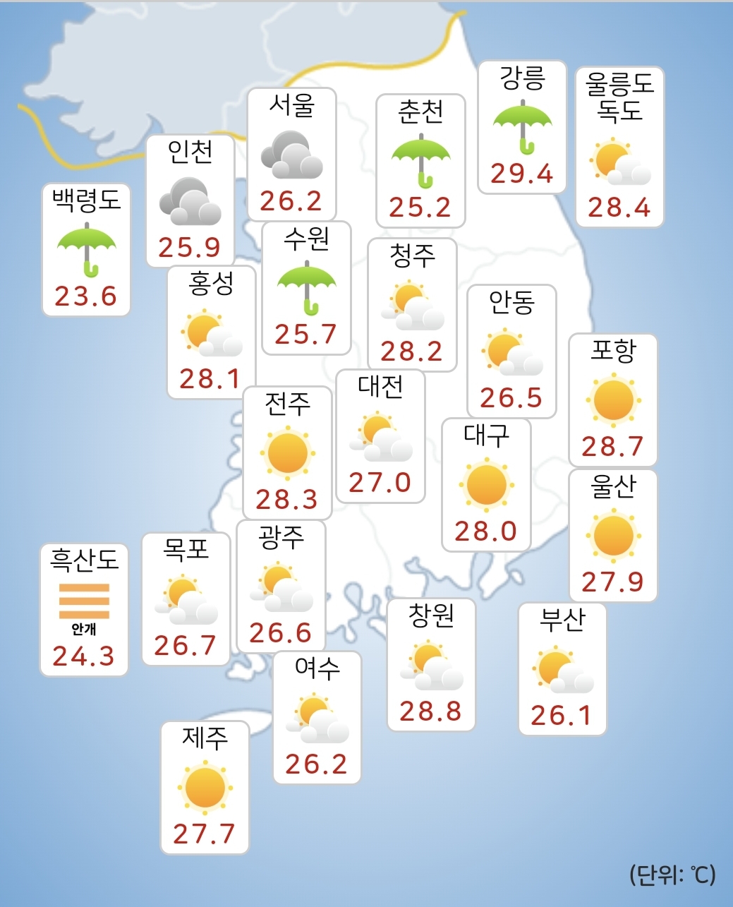 - 오늘(22일) 낮최고기온은 27~35도가 되겠습니다.