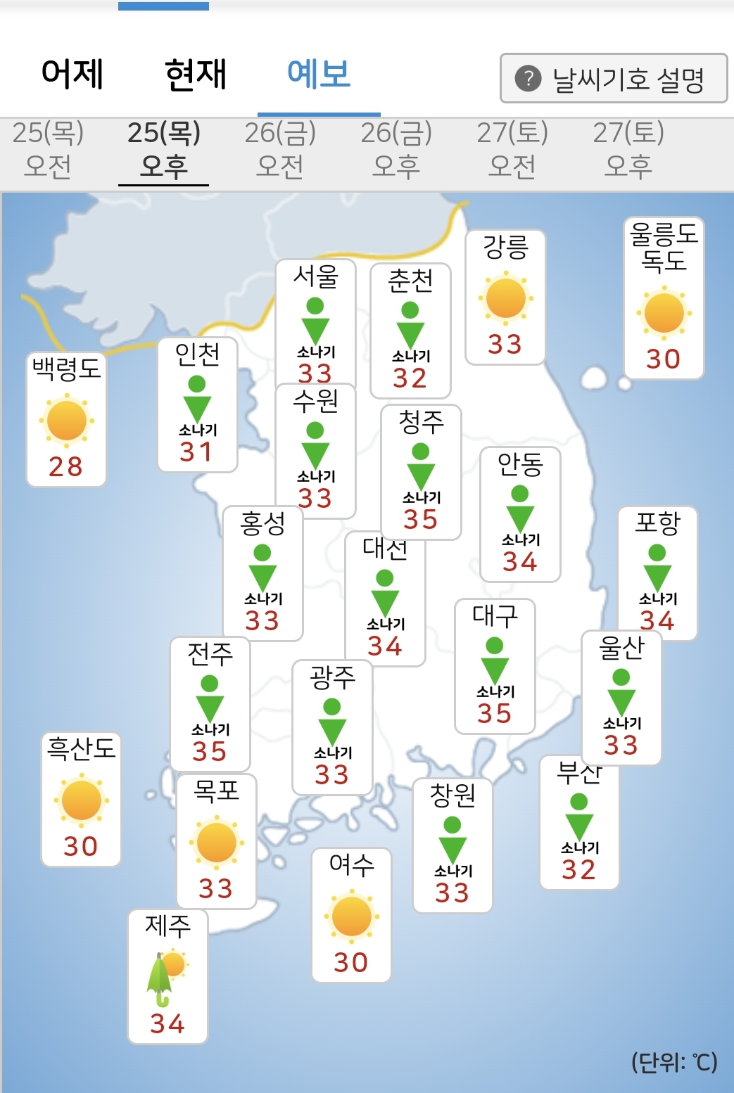 - 오늘(25일) 낮최고기온은 30~35도가 되겠습니다.