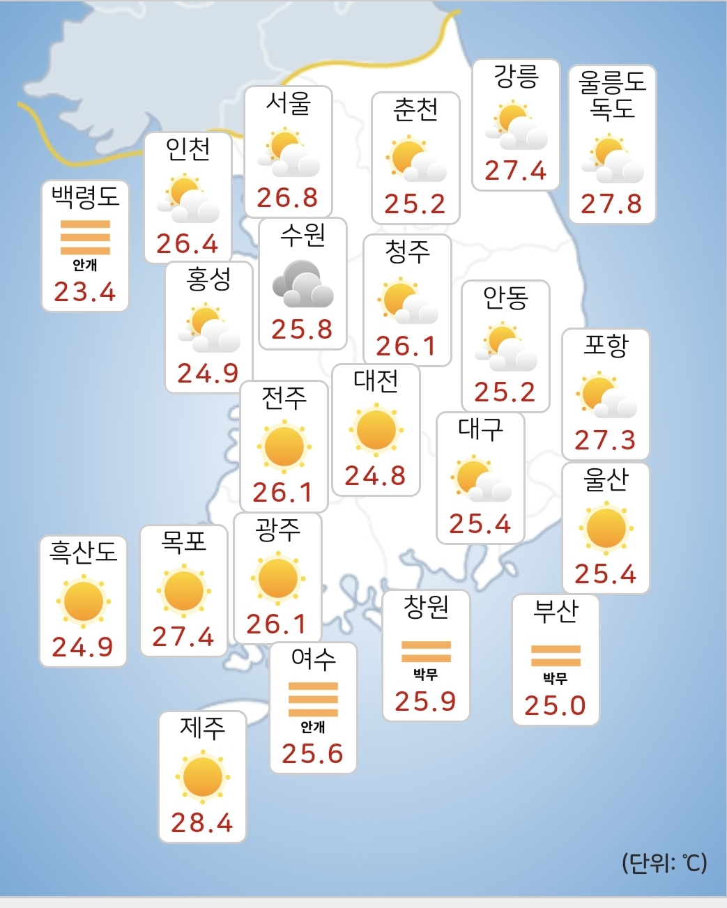 - 내일(26일) 아침최저기온은 24~27도, 낮최고기온은 29~34도가 되겠습니다.