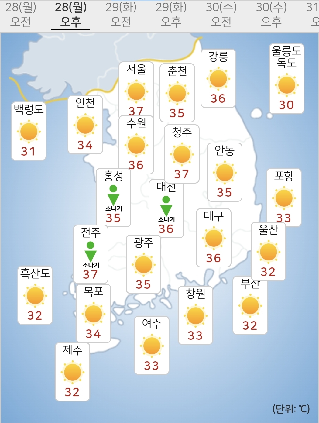 - 오늘(28일) 낮최고기온은 32~37도가 되겠습니다.