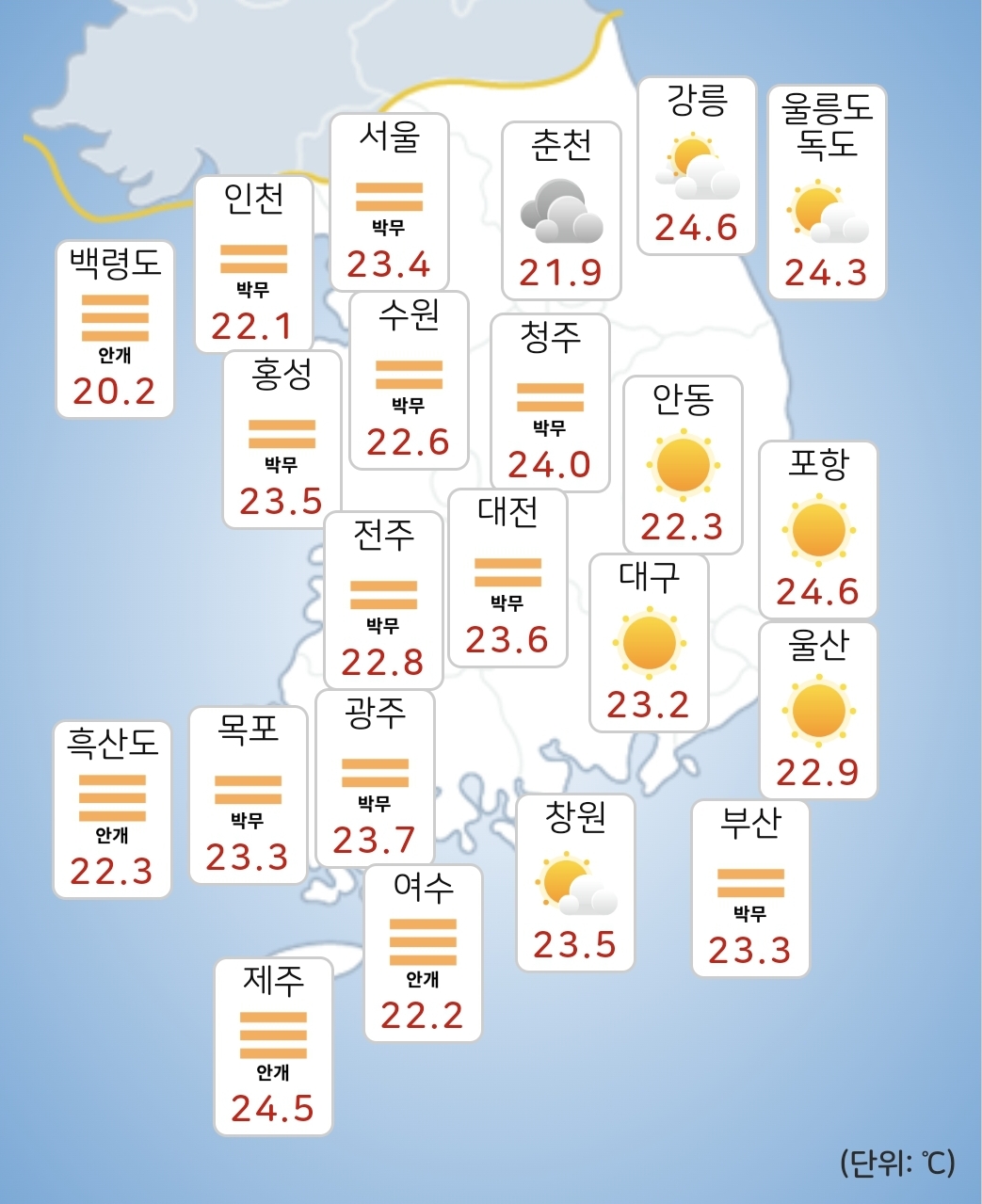 - 내일(5일) 아침최저기온은 21~26도, 낮최고기온은 26~33도가 되겠습니다.