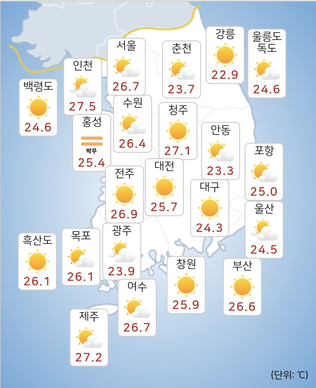 - 내일(16일) 아침최저기온은 22~27도, 낮최고기온은 29~34도가 되겠습니다.