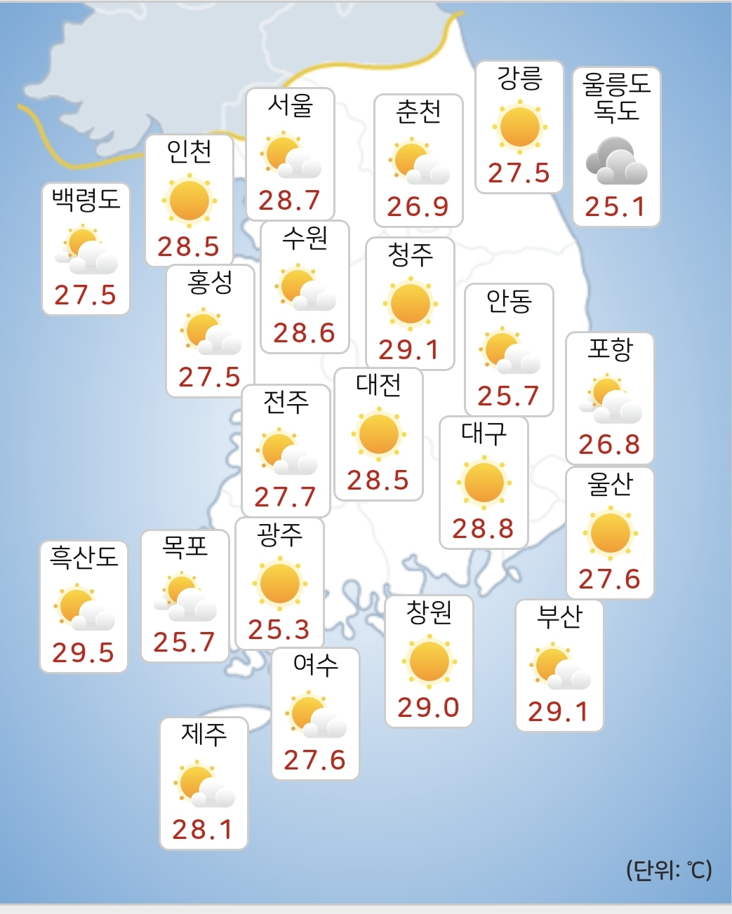 - 내일(18일) 아침최저기온은 22~27도, 낮최고기온은 30~35도가 되겠습니다.