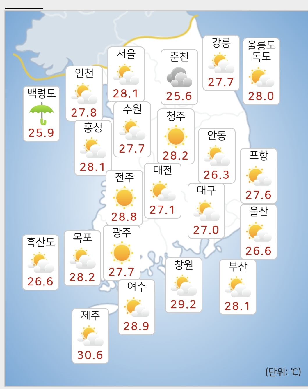 - 내일(23일) 아침최저기온은 23~28도, 낮최고기온은 31~35도가 되겠습니다.