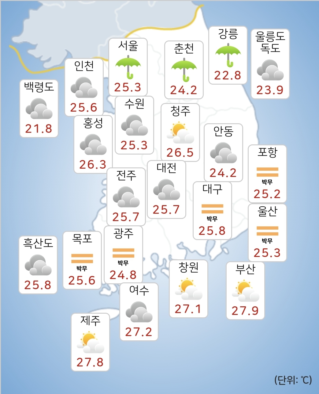 - 내일(28일) 아침최저기온은 20~25도, 낮최고기온은 29~33도가 되겠습니다.