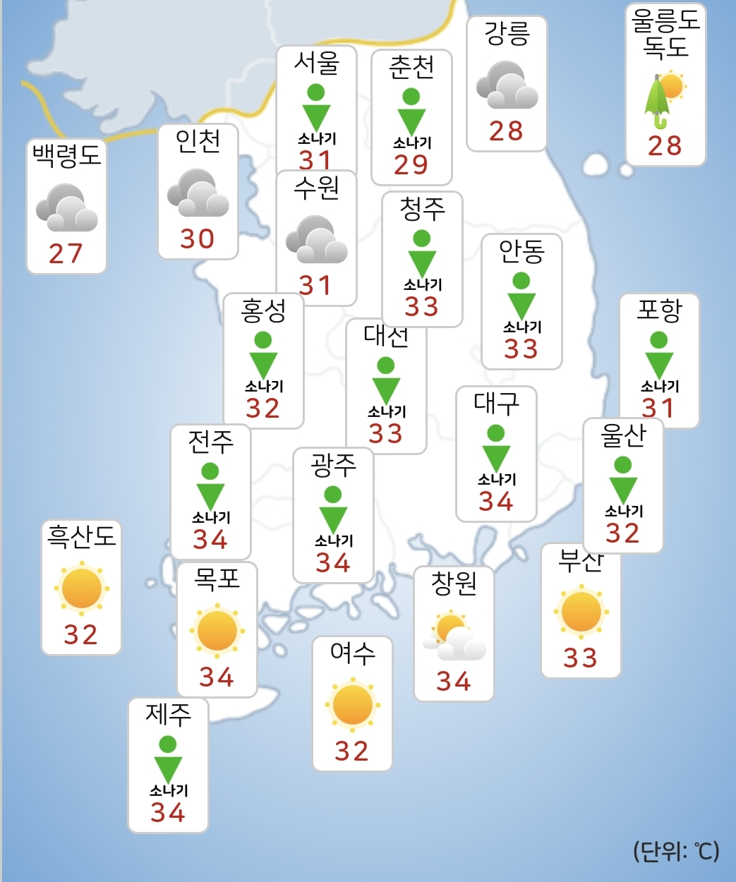 "(3일 전망) 내일까지 전국 무더위, 오늘~모레 전국 대부분 소나기 또는 비 곳"
