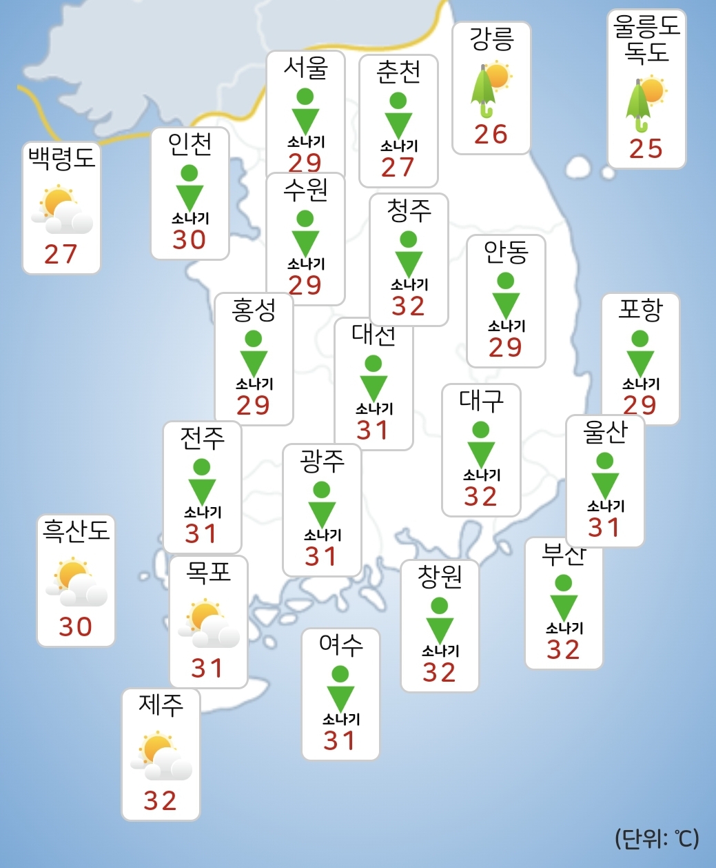 - 내일(7일) 아침최저기온은 20~25도, 낮최고기온은 26~33도가 되겠습니다.