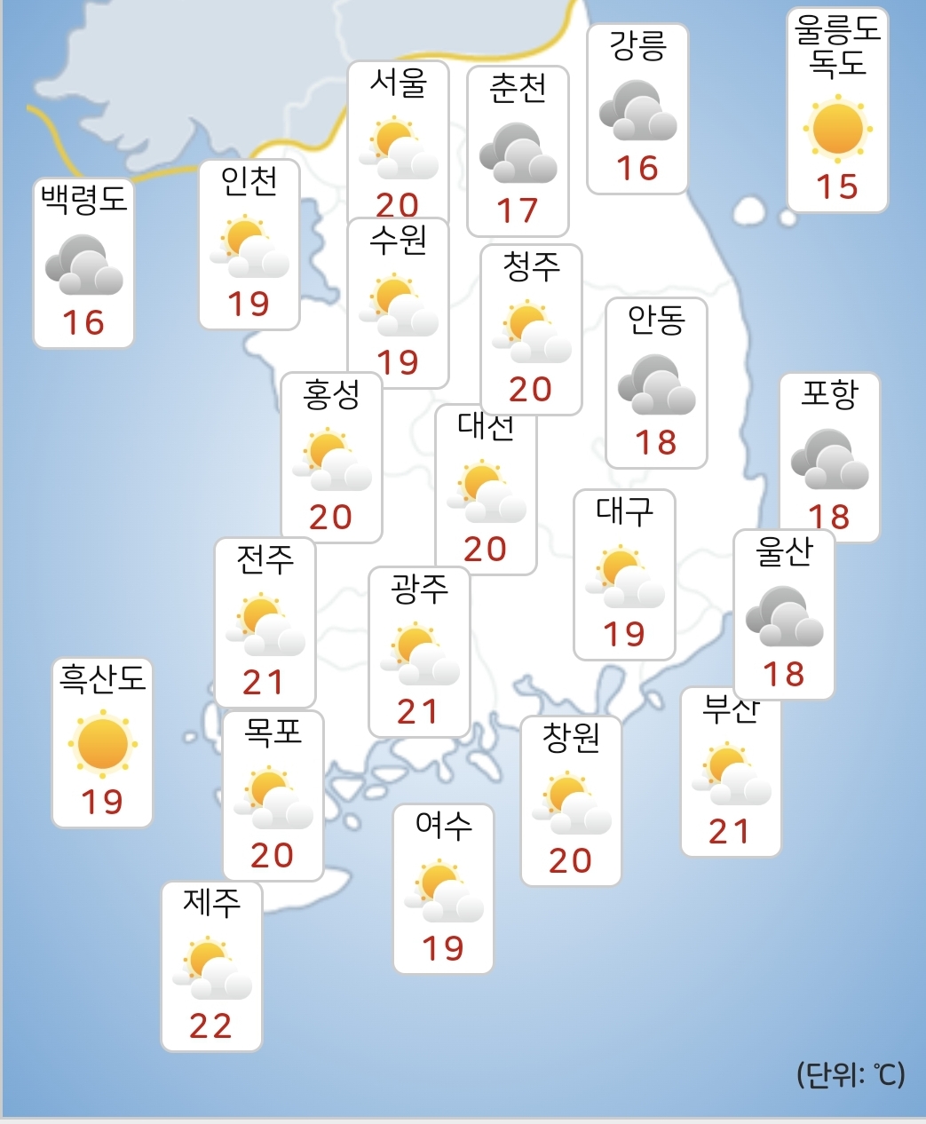 - 오늘(13일) 낮최고기온은 16~21도가 되겠습니다.