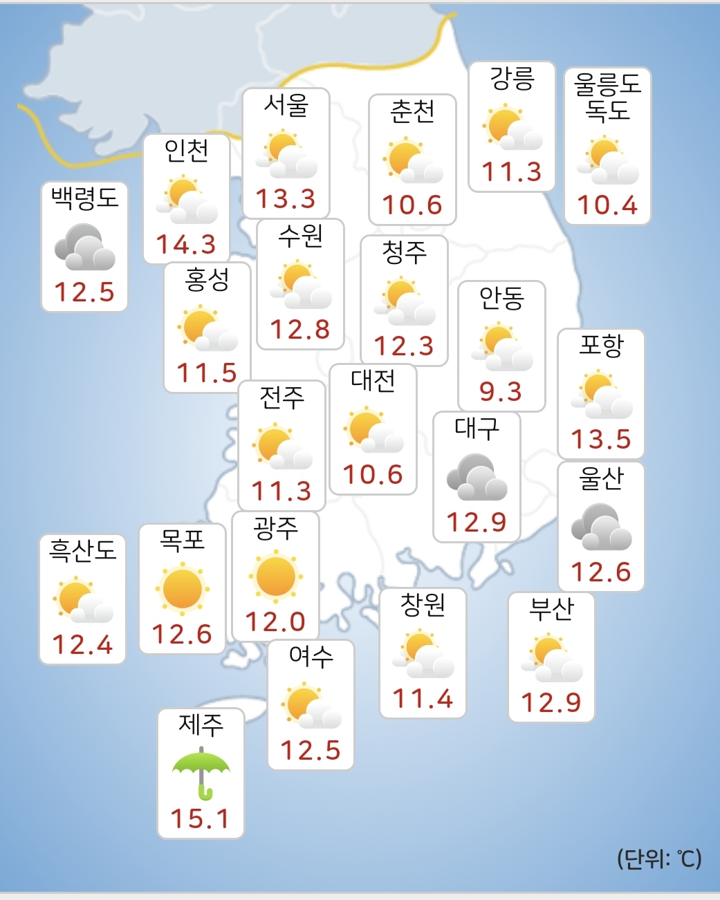 - 내일(24일) 아침최저기온은 9~14도, 낮최고기온은 13~21도가 되겠습니다.