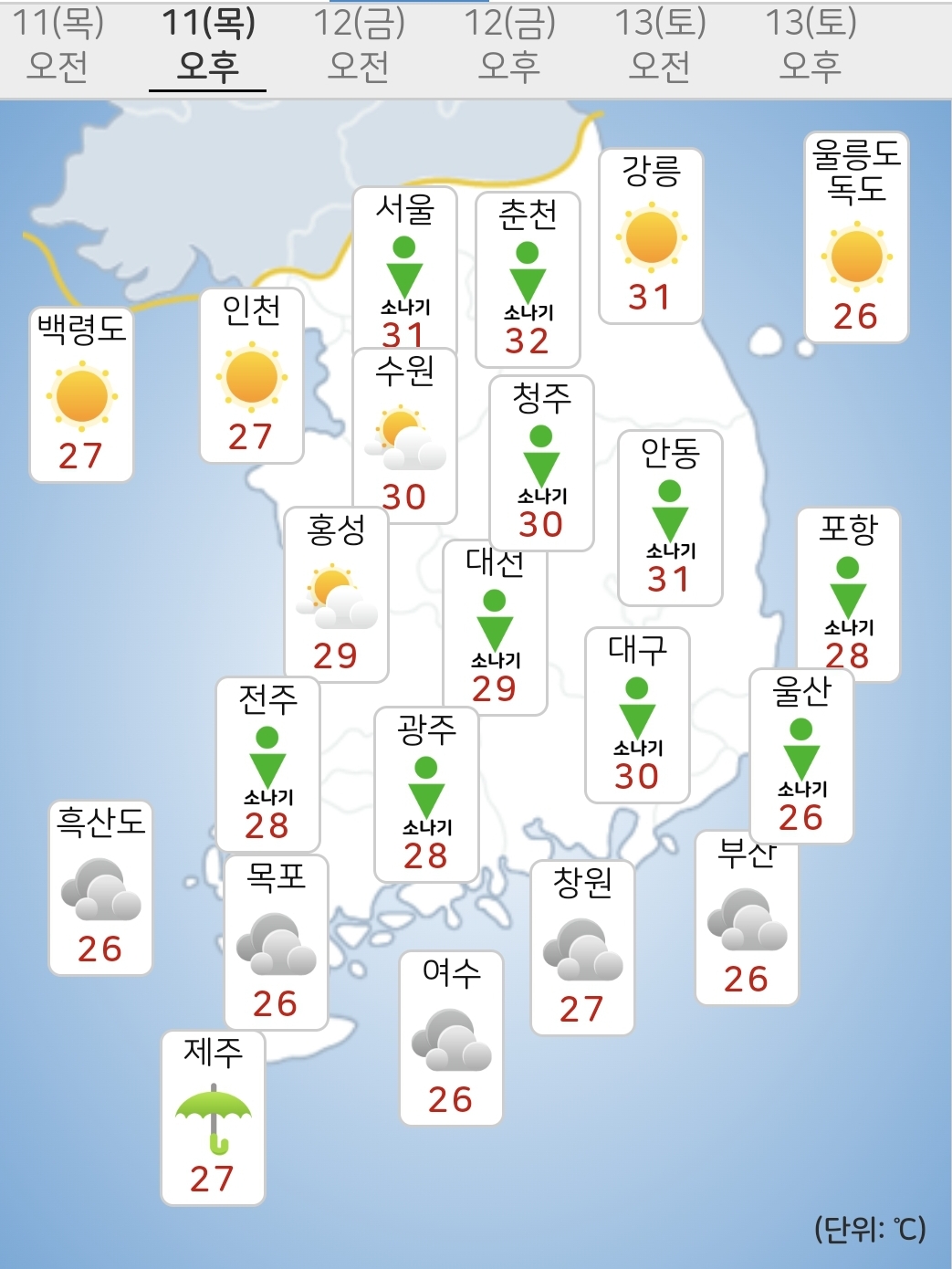 - 오늘(11일) 낮최고기온은 25~32도가 되겠습니다.