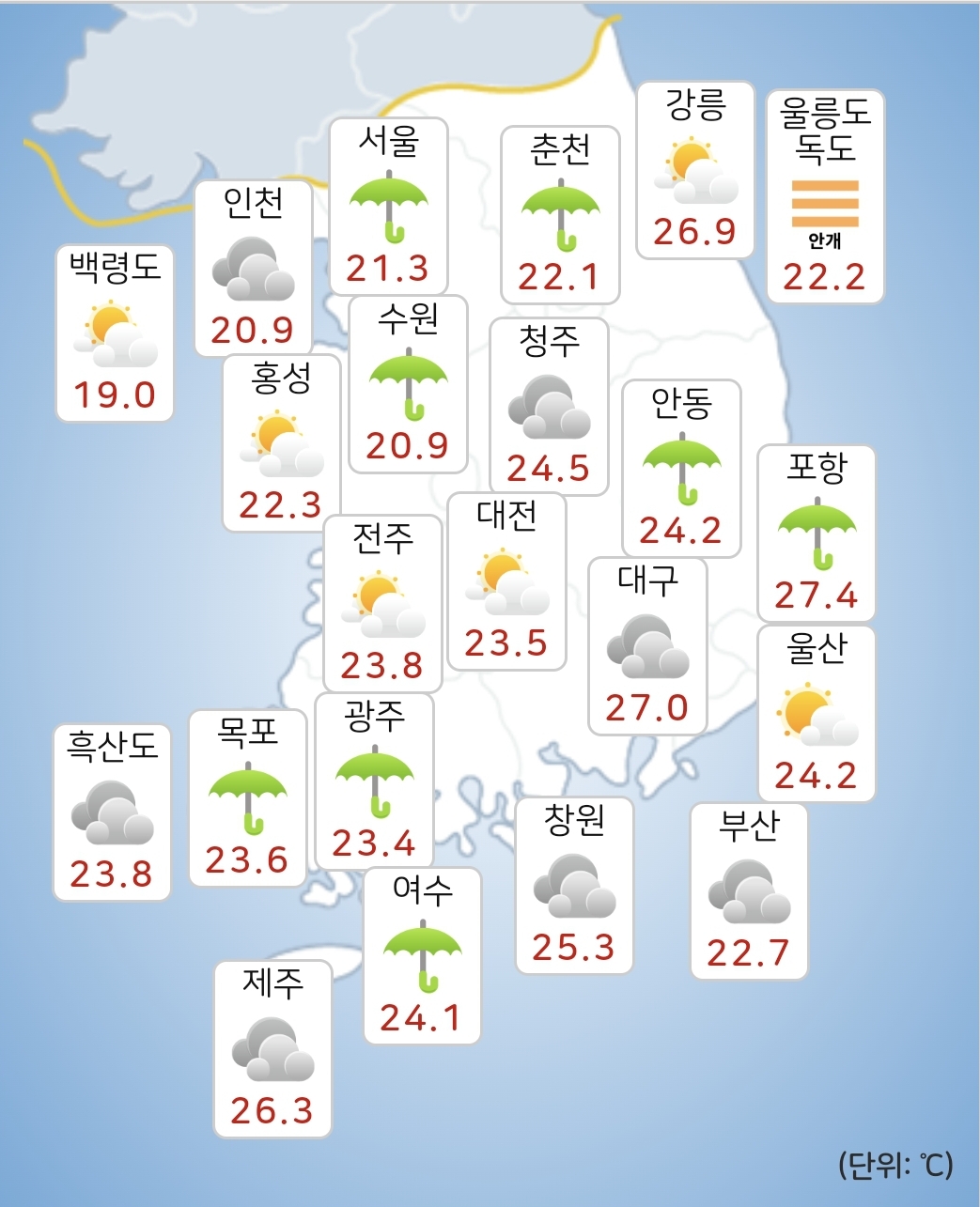 - 모레(7일) 아침최저기온은 21~27도, 낮최고기온은 26~33도가 되겠습니다.