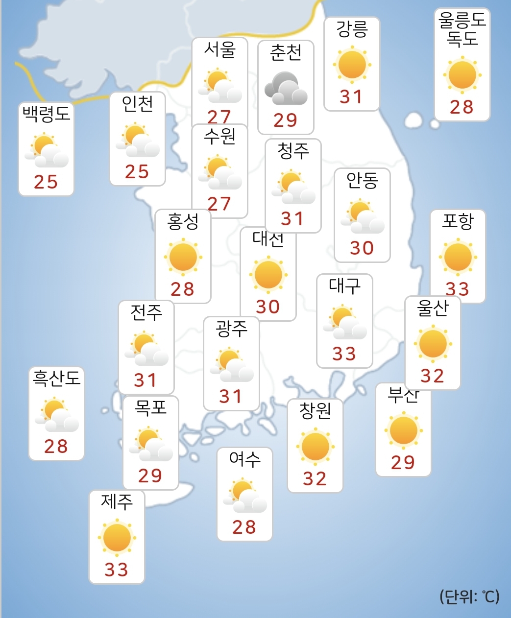 - 오늘(5일) 낮최고기온은 25~33도가 되겠습니다.