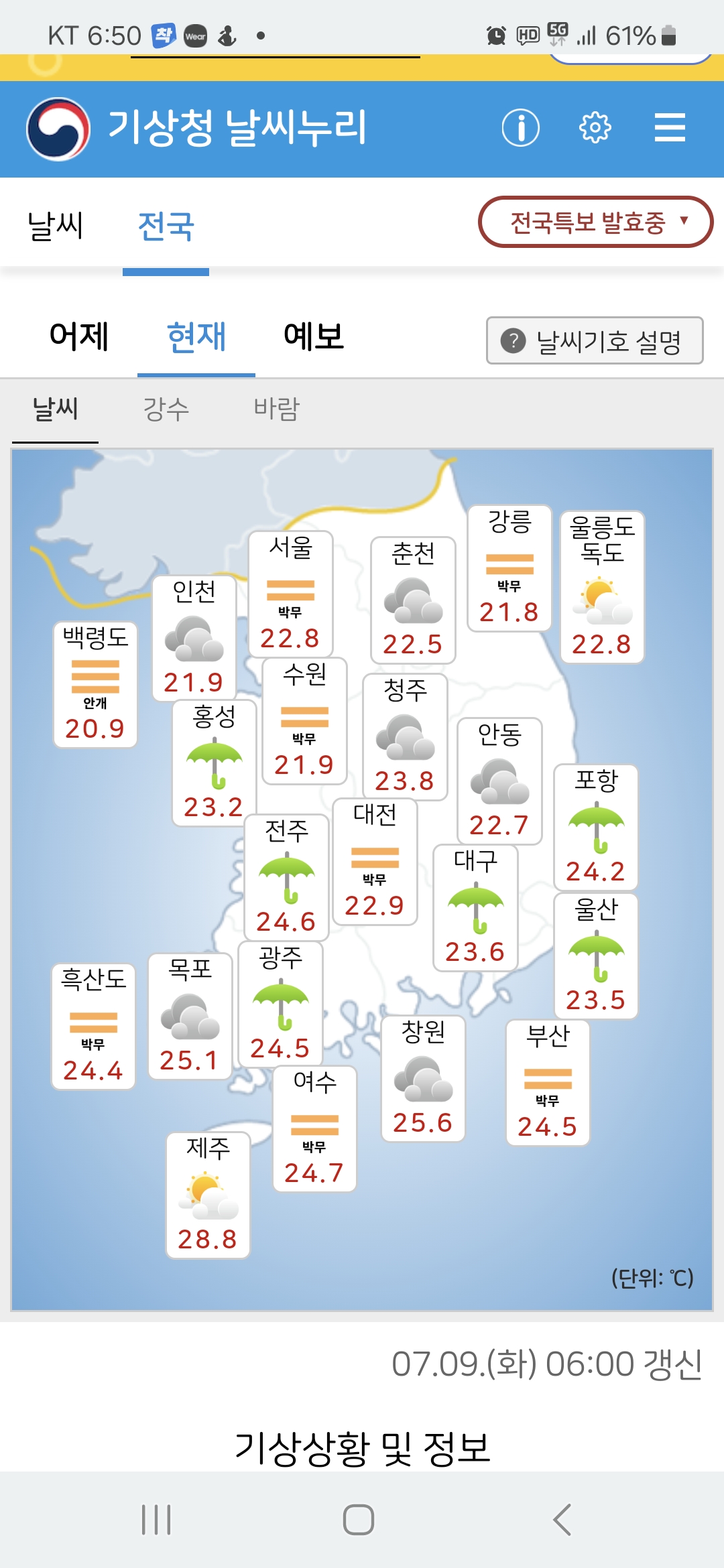 - 한편, 오늘(9일)부터 모레(11일) 사이 비나 소나기가 내리는 지역에서는 일시적으로 기온이 조금 내려가겠으나, 비가 그친 뒤에는 습도가 높은 상태에서 낮 동안 다시 기온이 올라 무덥겠으니, 앞으로 발표되는 기상정보를 참고하기 바랍니다.