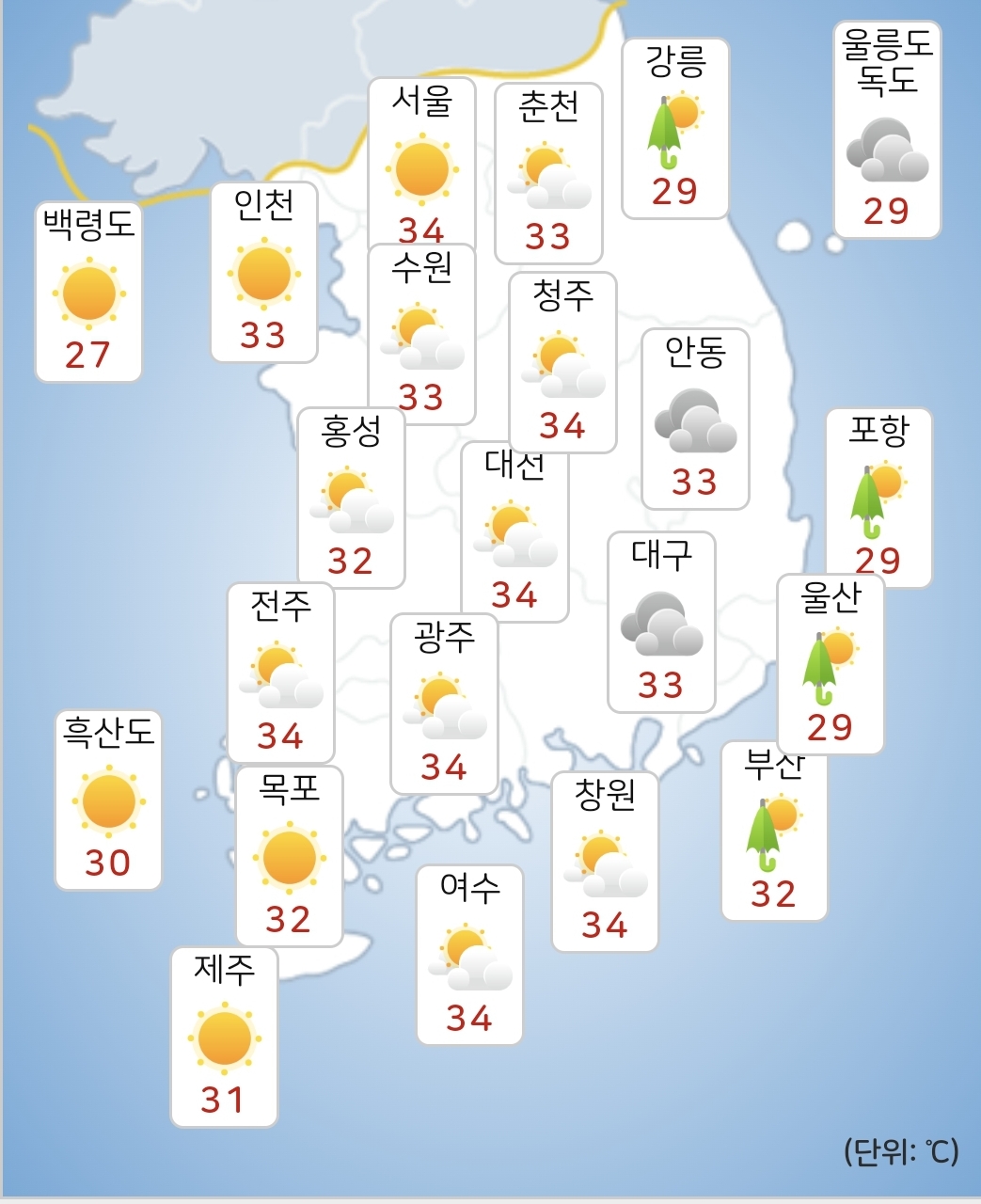 - 내일(31일) 아침최저기온은 19~25도, 낮최고기온은 29~34도가 되겠습니다.