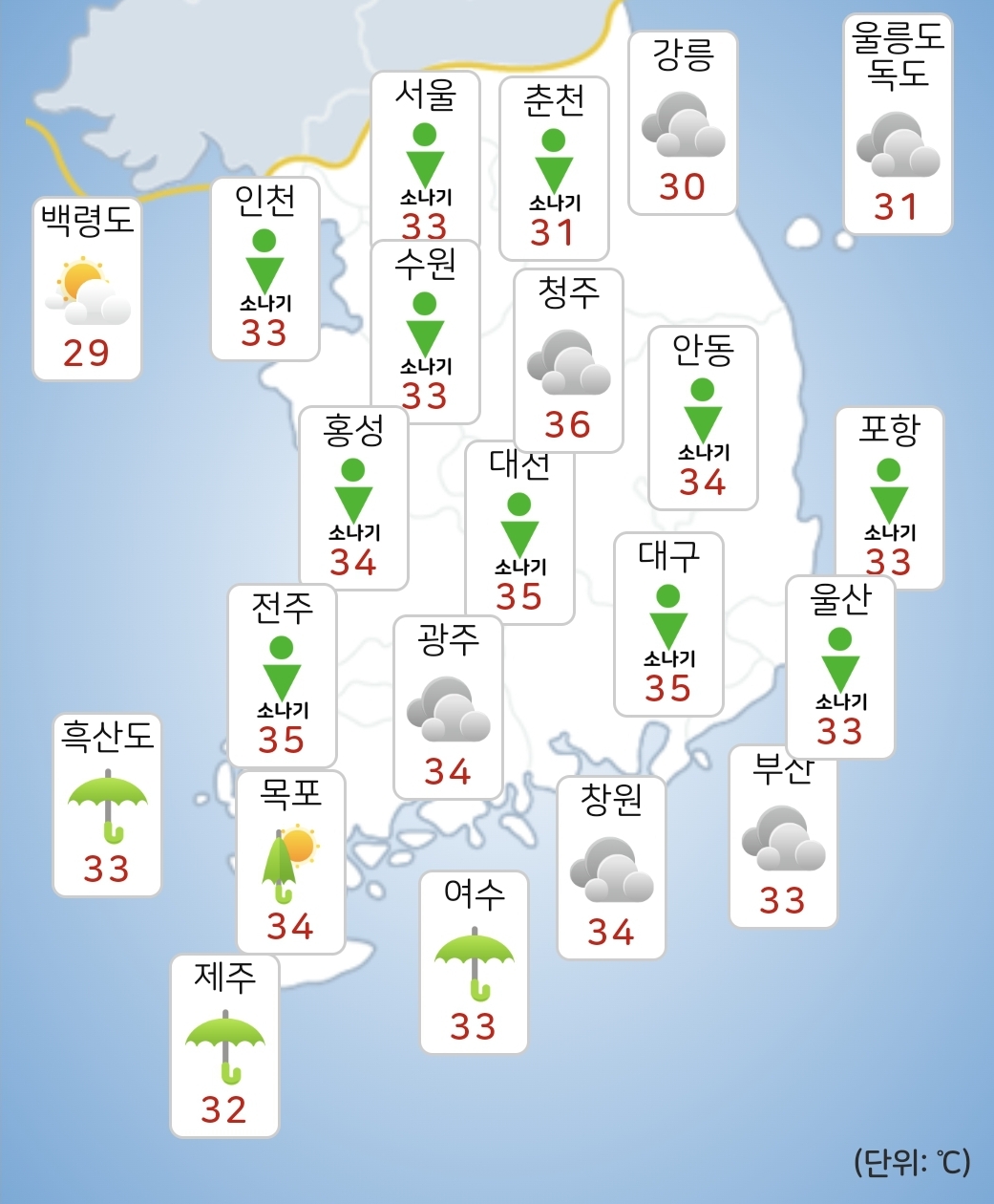 - 오늘(19일) 낮최고기온은 27~36도가 되겠습니다.