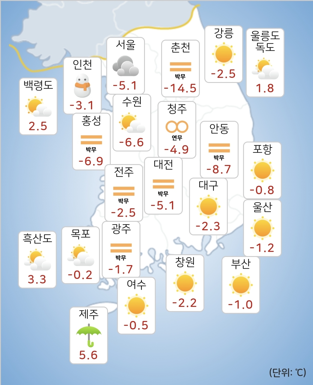 - 모레(15일) 아침최저기온은 -14~-1도, 낮최고기온은 -4~5도가 되겠습니다.