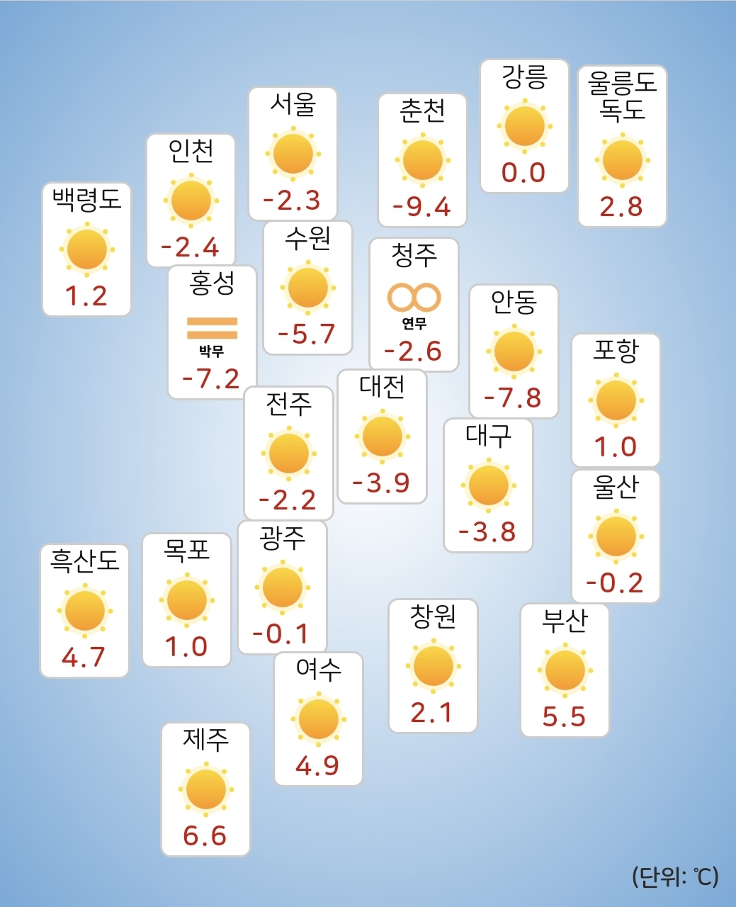 - 내일(25일) 아침최저기온은 -5~5도, 낮최고기온은 5~11도가 되겠습니다.