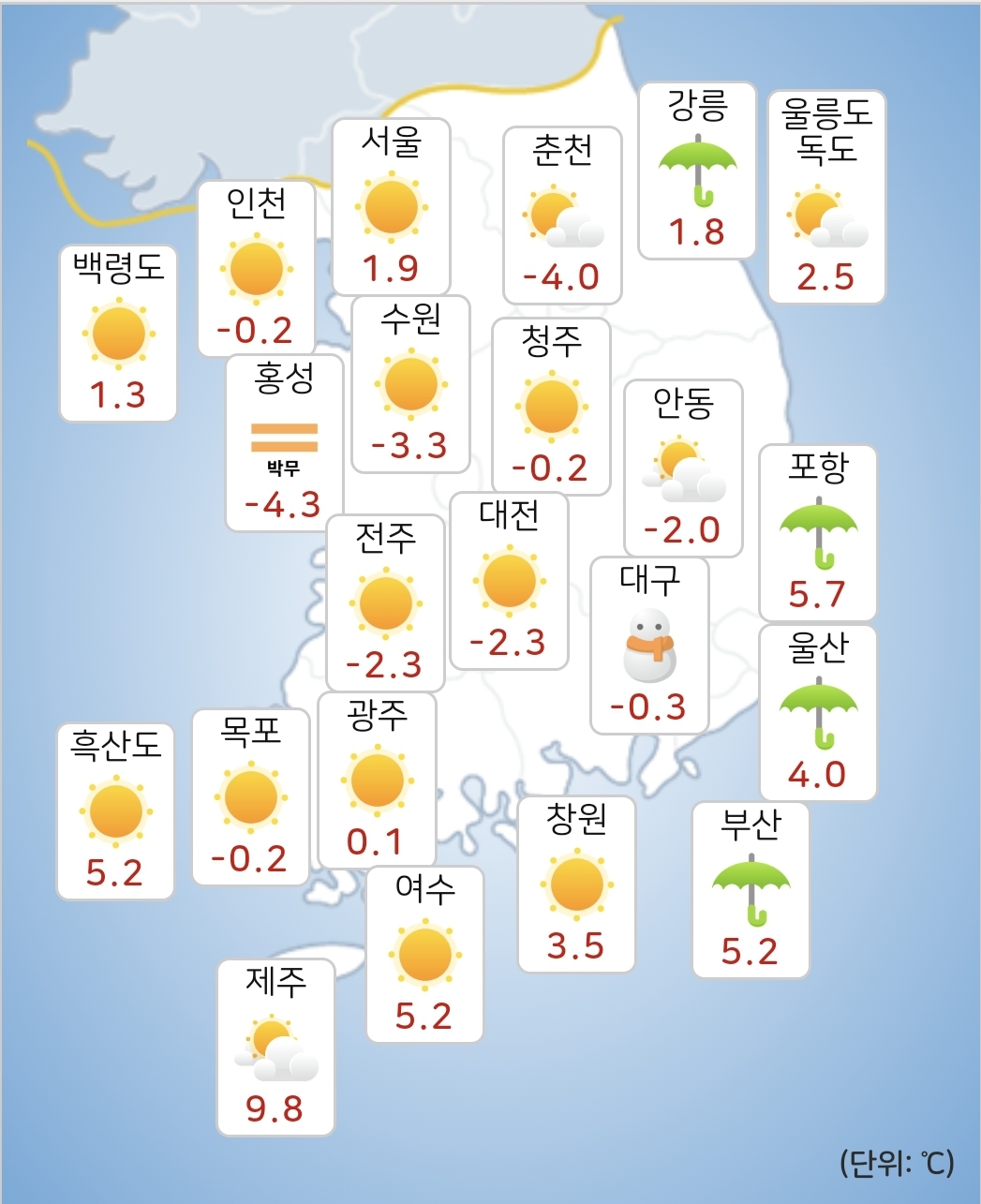 - 30일(목) 아침 기온은 -10~-1도, 낮 기온은 0~8도, 31일(금) 아침 기온은 -11~1도, 낮 기온은 2~9도가 되겠습니다.