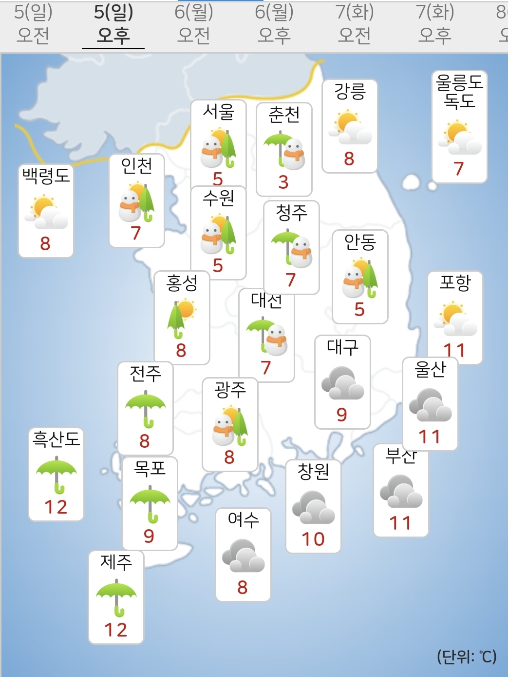 - 오늘(5일) 낮최고기온은 3~11도가 되겠습니다.