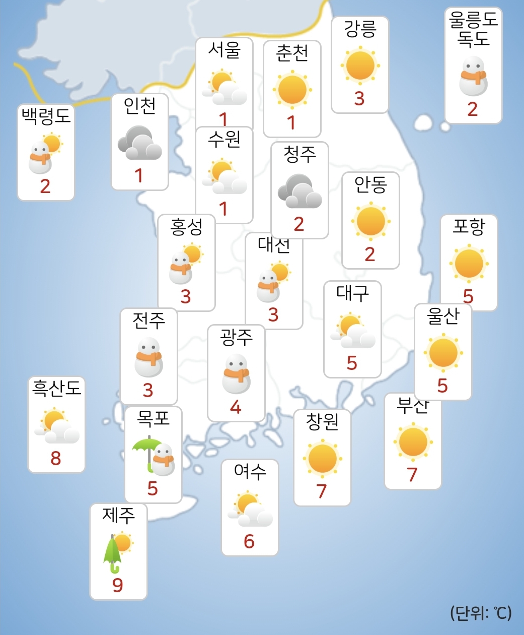 - 모레(9일) 아침최저기온은 -17~-3도, 낮최고기온은 -8~3도가 되겠습니다.