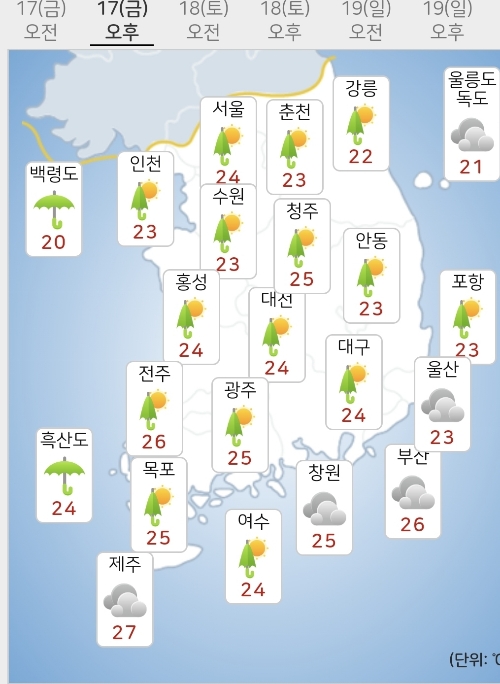 - 오늘(17일) 낮최고기온은 19~26℃가 되겠습니다.