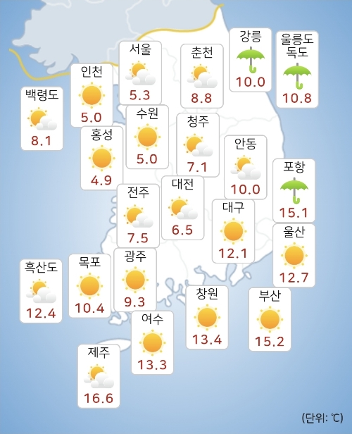 - 모레(22일) 아침최저기온은 3~14℃, 낮최고기온은 14~22℃가 되겠습니다.