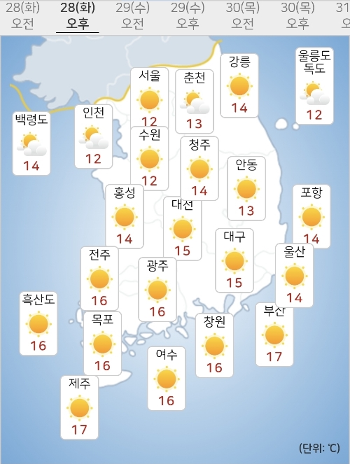 - 오늘(28일) 낮최고기온은 11~18℃가 되겠습니다.