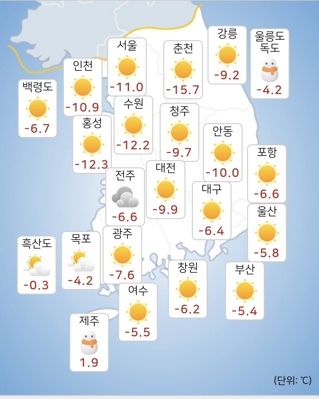 - 특히, 글피 아침 기온이 중부내륙과 전북동부, 경상내륙을 중심으로 -10도 이하(경기북부와 강원내륙.산지, 충북북부, 경북북부 -15도 내외)로 매우 낮아 강추위가 이어지겠습니다.