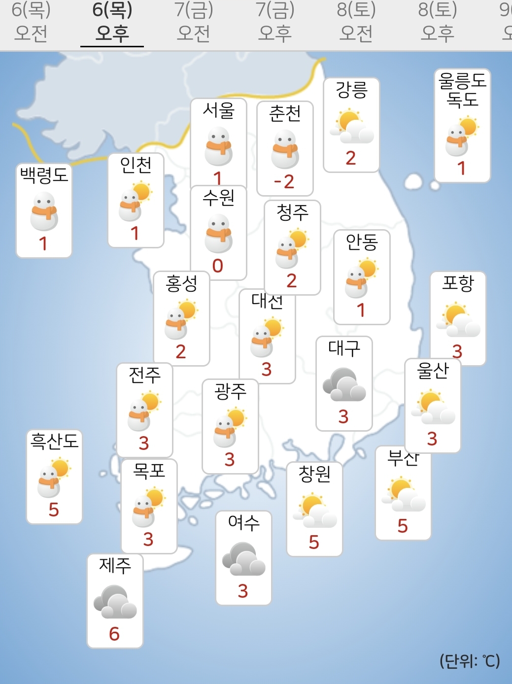 - 오늘(6일) 낮최고기온은 -3~5도가 되겠습니다.
