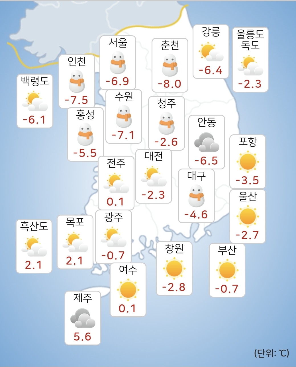 - 오늘(7일) 낮최고기온은 -9~4도가 되겠습니다.