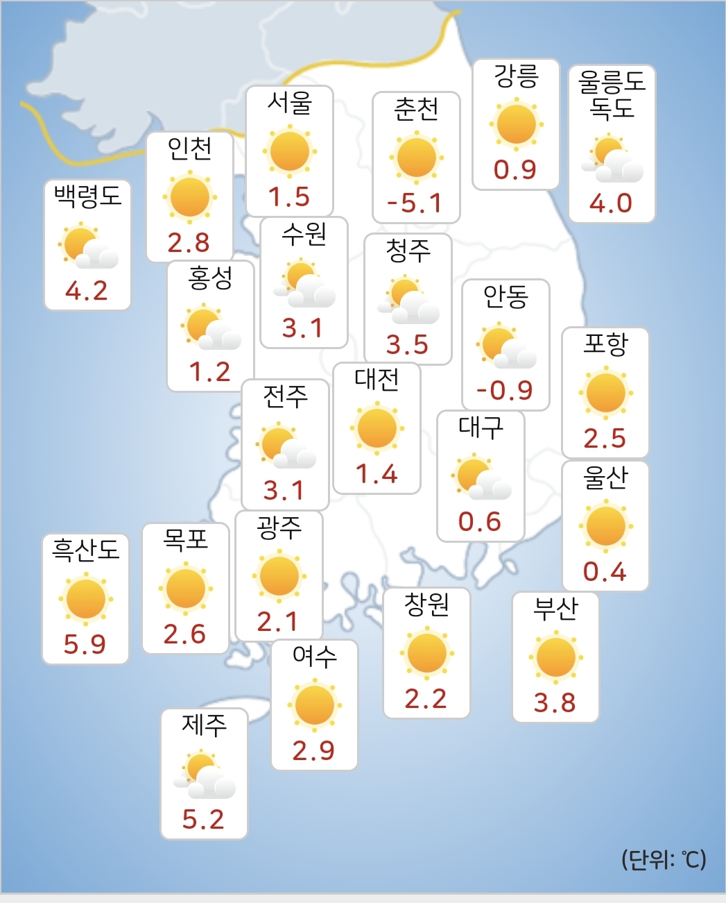 ○ 당분간 기온은 평년(최저 0~8도, 최고 13~17도)과 비슷하겠고, 전국 내륙에서 낮과 밤의 기온차가 15도 이상으로 크겠으니, 건강관리에 유의하기 바랍니다.