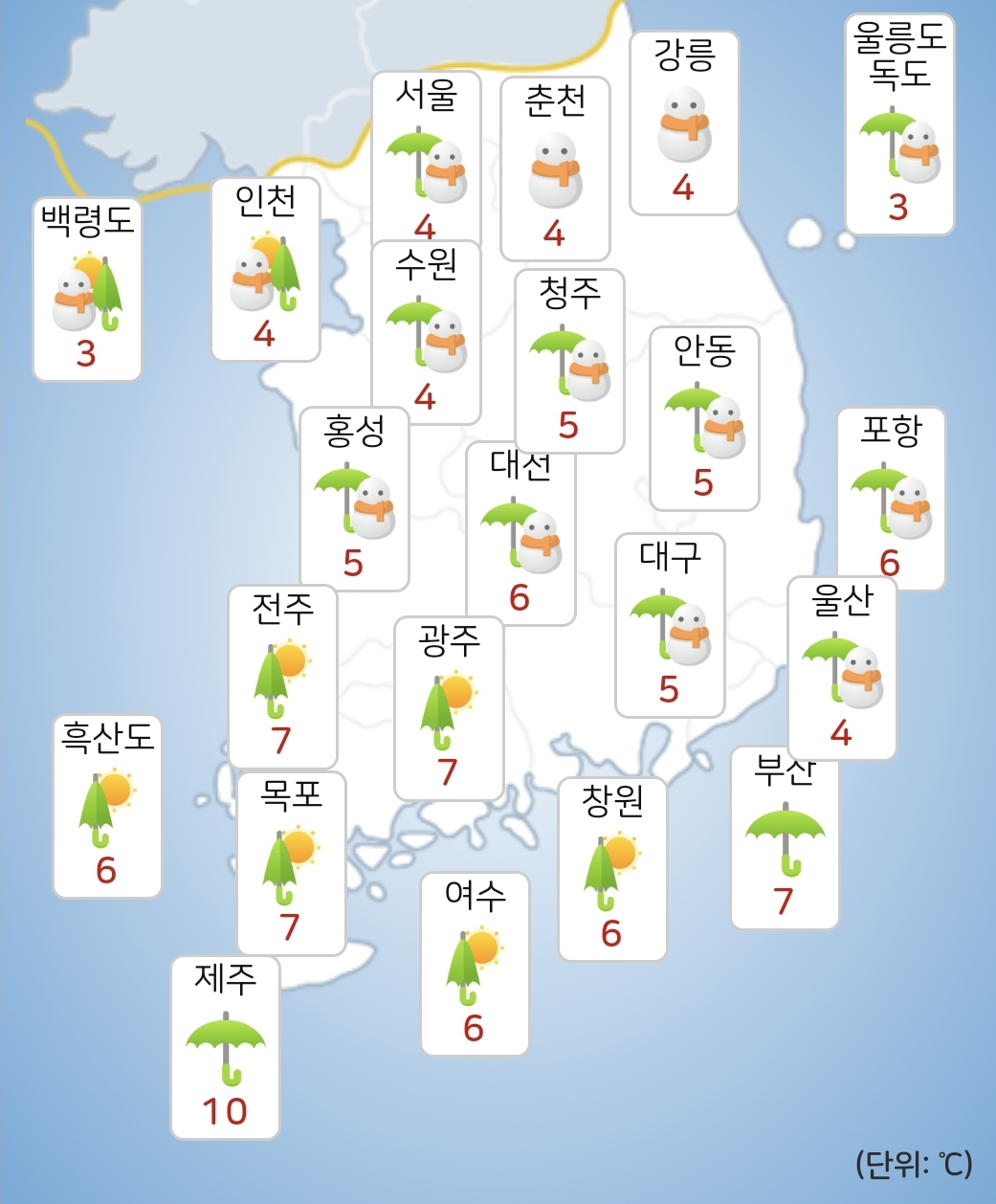 - 내일(5일) 아침최저기온은 -4~5도, 낮최고기온은 4~11도가 되겠습니다.