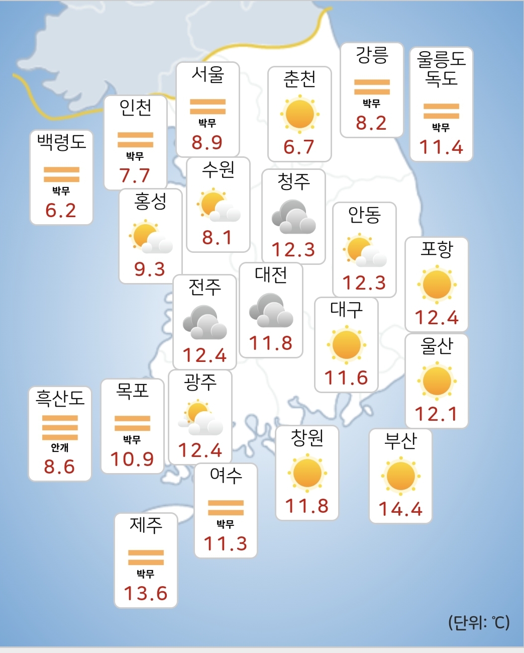 - 내일(11일) 아침최저기온은 4~11도, 낮최고기온은 17~25도가 되겠습니다.