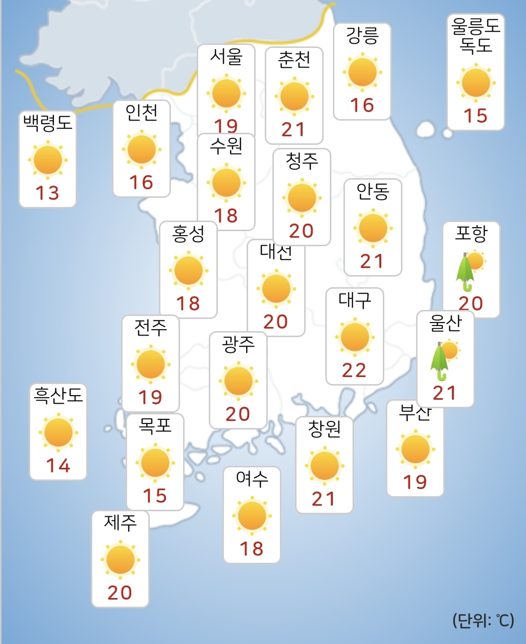- 오늘(10일) 낮최고기온은 15~22도가 되겠습니다.