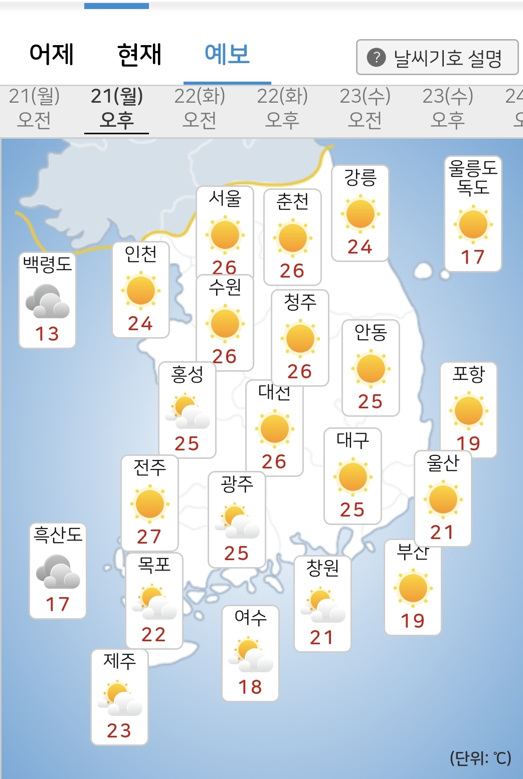 - 내일(22일) 아침최저기온은 11~17도, 낮최고기온은 15~21도가 되겠습니다.